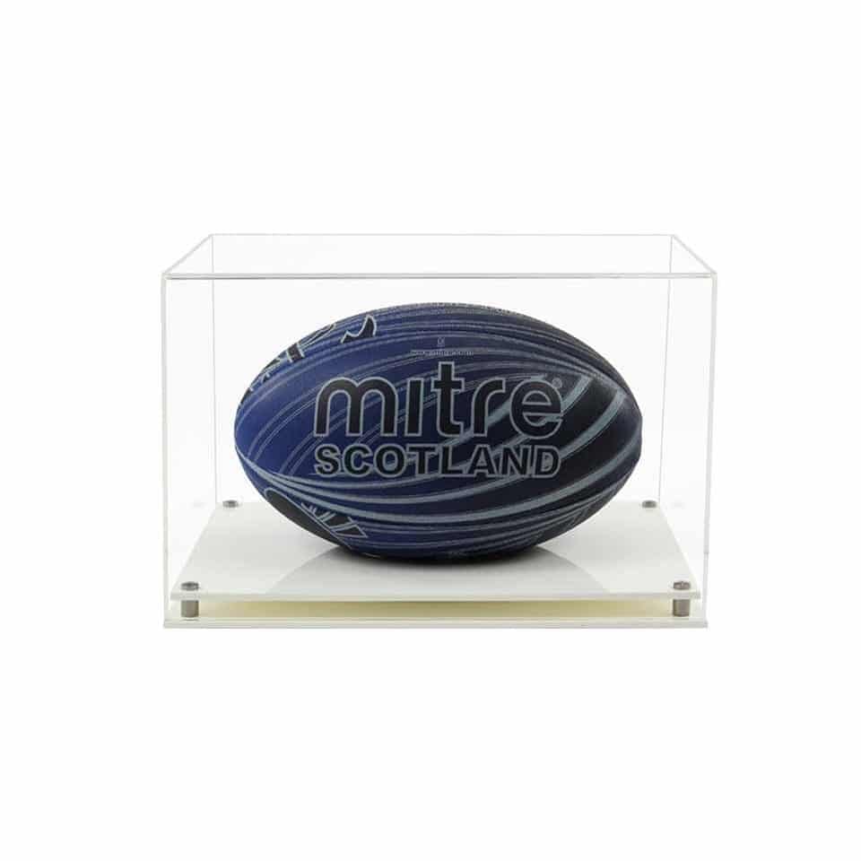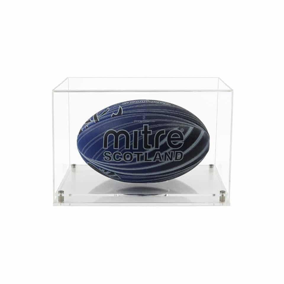 Dette utstillingsskapet er designet for å vise frem en standard rugbyball i størrelse 5 horisontalt. Det har et hull i den øverste delen av bunnen som holder rugbyballen din sentralt i utstillingsskapet. Hvis du vil bruke dette utstillingsskapet til noe annet enn en rugbyball og ikke ønsker et hull i toppen av bunnen, kan du se på boksehanske montre som er nøyaktig det samme, men ikke har et hull i toppen av basen. Vi har også en lignende montre som holder rugbyballen vertikalt, det kan du se her..