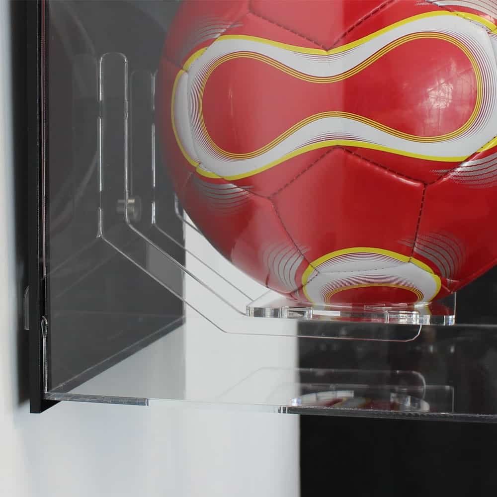 This football display case has been designed to suit a size 5 football, It includes a football display stand that will hold your football inside the display case.The back panel is fixed to the wall using our stainless steel supports, which when fitted leave no sign of the screw head. The football support brackets are then fitted to it.The front cover is easily removable and hooks into the slots on the back panel, which makes it very easy to remove when you want to remove it, but still secure enough not to be knocked off. To remove the front cover you just push it up and then lift it away.The display cover is made from 3mm thick UV blocking acrylic, which will not only protect from over 90% of UV light, it will also protect from dust and inquisitive fingers. The display cover can easily be removed from the back panel to access your football.