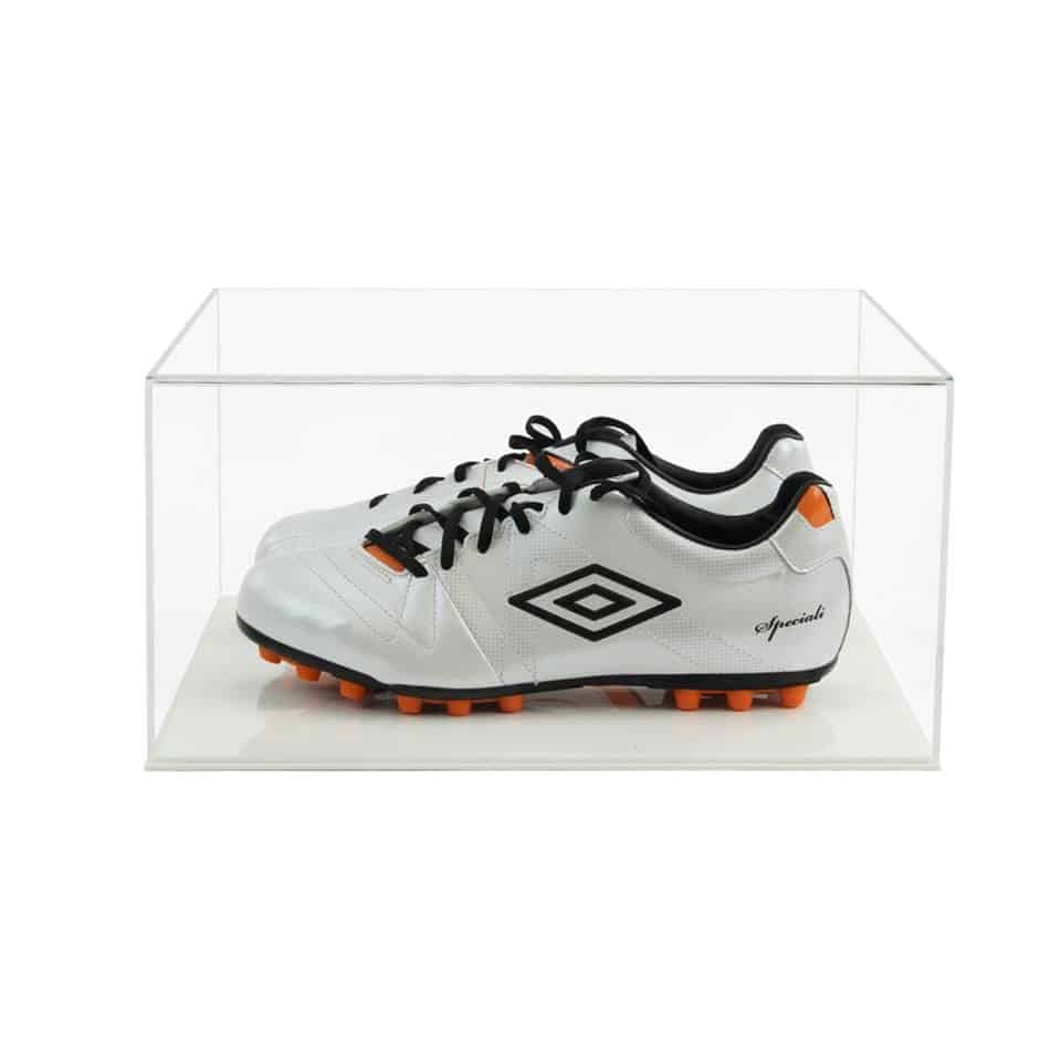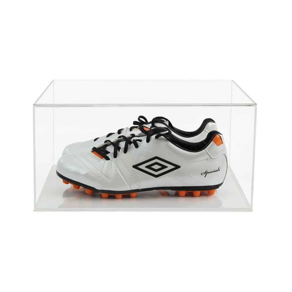 This display case has been designed to display and protect a pair of signed football boots, it should fit most sizes but please check the measurements first to make sure it will fit yours.The 5mm thick acrylic base features a rebate machined all around in order to form a step, the inside of which sits inside the display case and will prevent the cover from sliding off.The four rubber non slip feet we supply with these display boxes are self adhesive, you just choose how you wish to use the display box and stick them on the right side to suit your purpose.