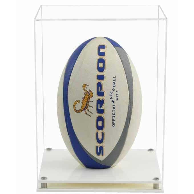 This rugby ball display case has a hole in the middle of the top layer that will hold your rugby ball in place. This display case is also available without the hole in the base for the rugby ball, just select ‘no central hole’ from the menu. We also have a display case of this style that will display your rugby ball horizontally.