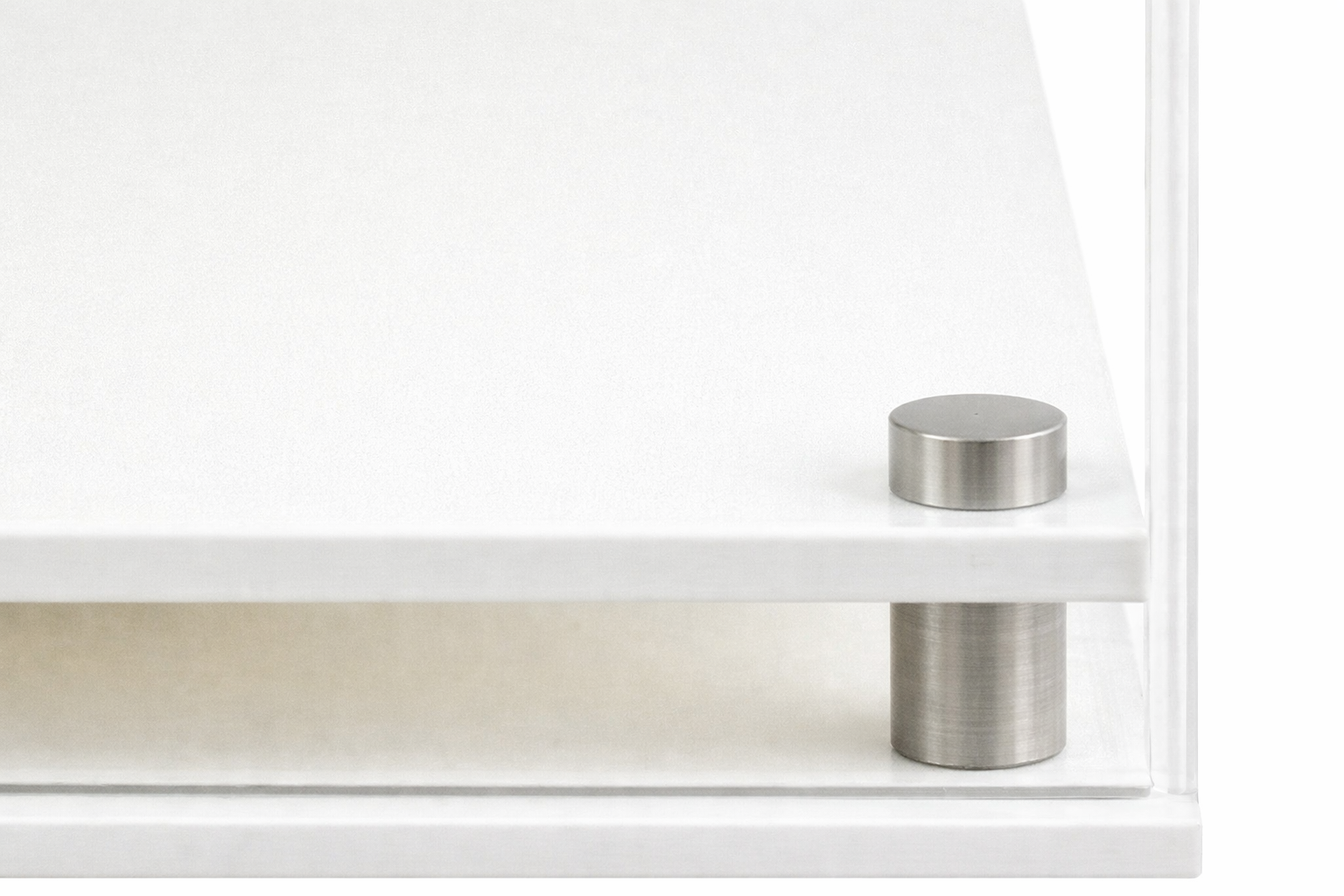 • Closeup image of the corner of the white modern base, showing the acrylic and the stainless steel corner support