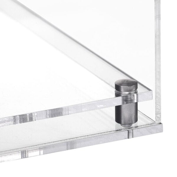 • Closeup image of the corner of the clear modern base, showing the acrylic and the stainless steel corner support